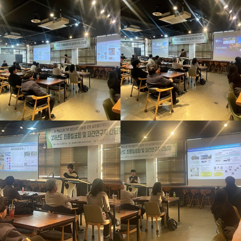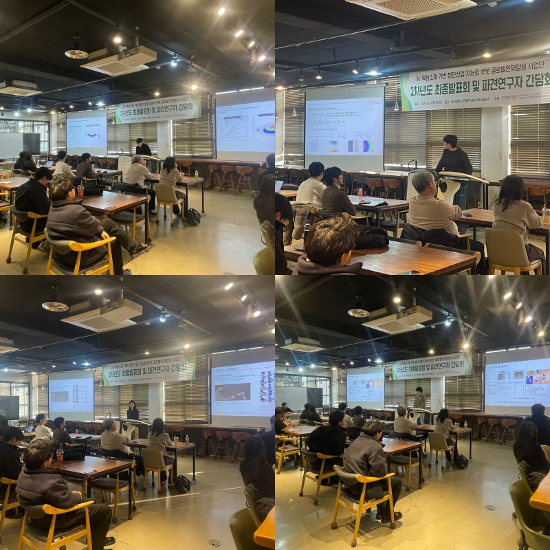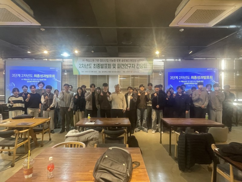 2차년도 최종발표회 및 파견연구자 간담회 페이지 정보 작성자 관리자 조회18회 작성일 26-03-16 15:06 본문 AI-핵심소재기반첨단산업지능형로봇 글로벌인재양성사업단 2차년도 파견연구원 최종성과발표회를 2026년 3월 12일에 실시하였고, 참여대학원생 및 참여교수가 참석하여 아래와 같이 발표를 진행하고 3차년도 파견 연구자들과의 석식 겸 간담회를 진행했습니다. 목록